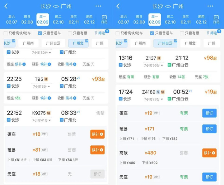 记者查询12306App发现,此次18元低价硬座票对应长沙至广州北的普速列车(长沙至广州白云硬座票为19元),全程耗时约8小时(部分车次7小时41分钟),为原价93元硬座票的2折优惠,同时硬卧票也同步推出5折优惠,折后低至81元,部分车次实现夕发朝至,适配时间灵活的出行人群需求。目前春运期间(2月10日前后)该方向优惠车票仍有部分余票,其余时段长沙至广州普速列车硬座票价多为93元或98元,高铁票价则在170元至300元不等。